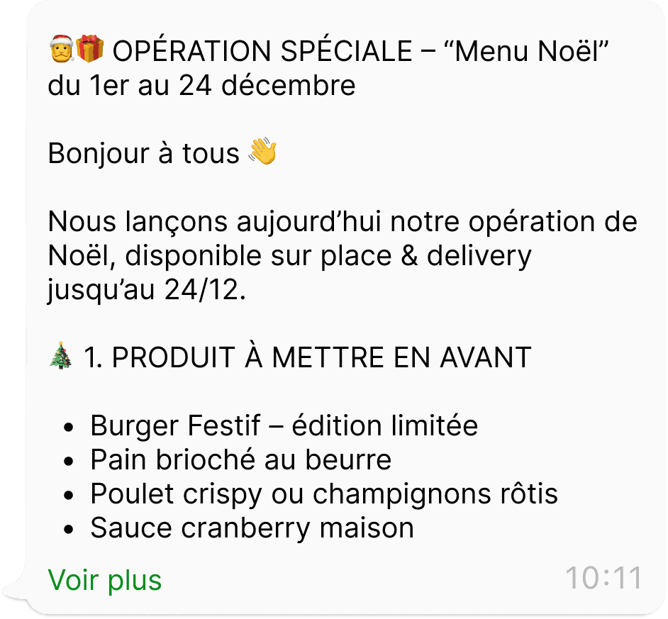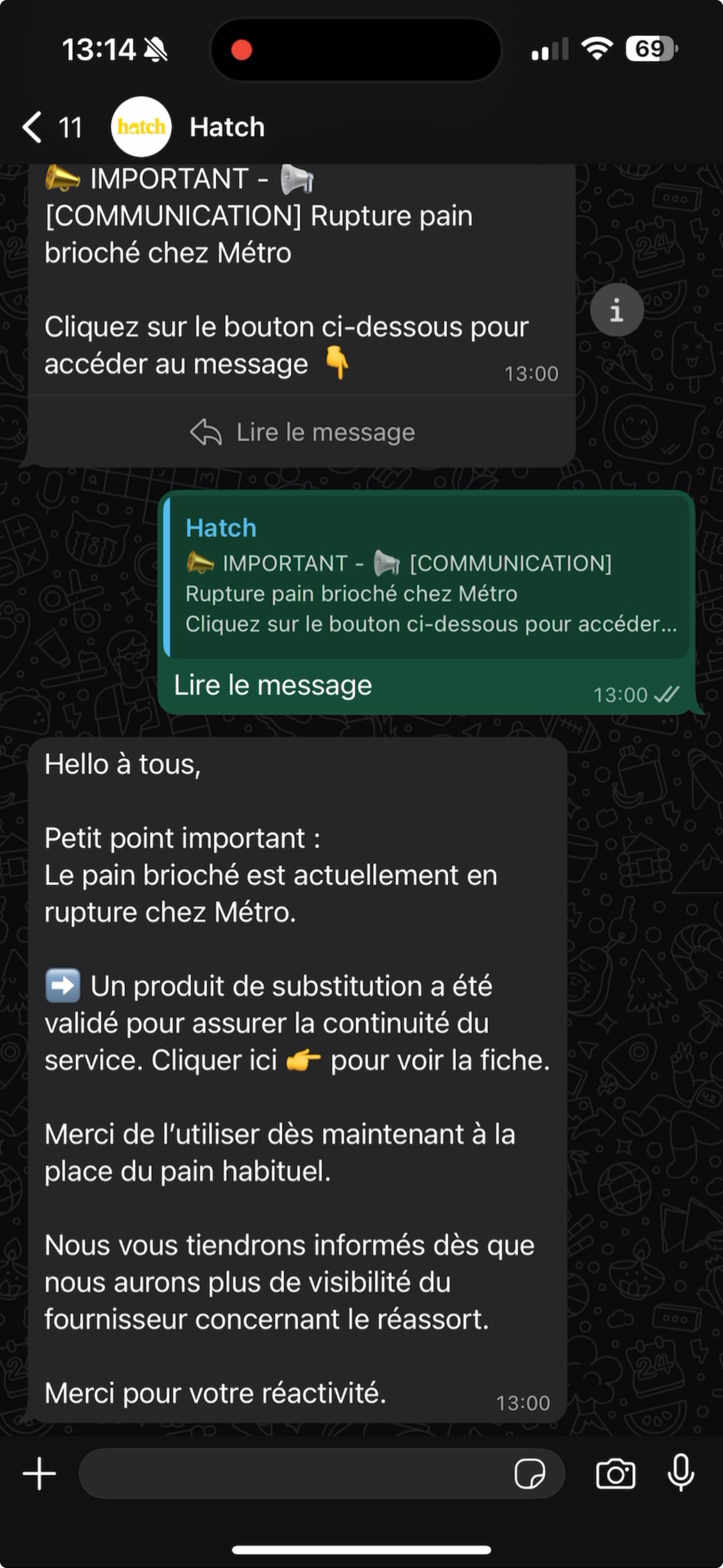 Ruptures, nouveaux process, standards, procédures… Diffusés dans WhatsApp pour garantir la même information sur tous les sites.